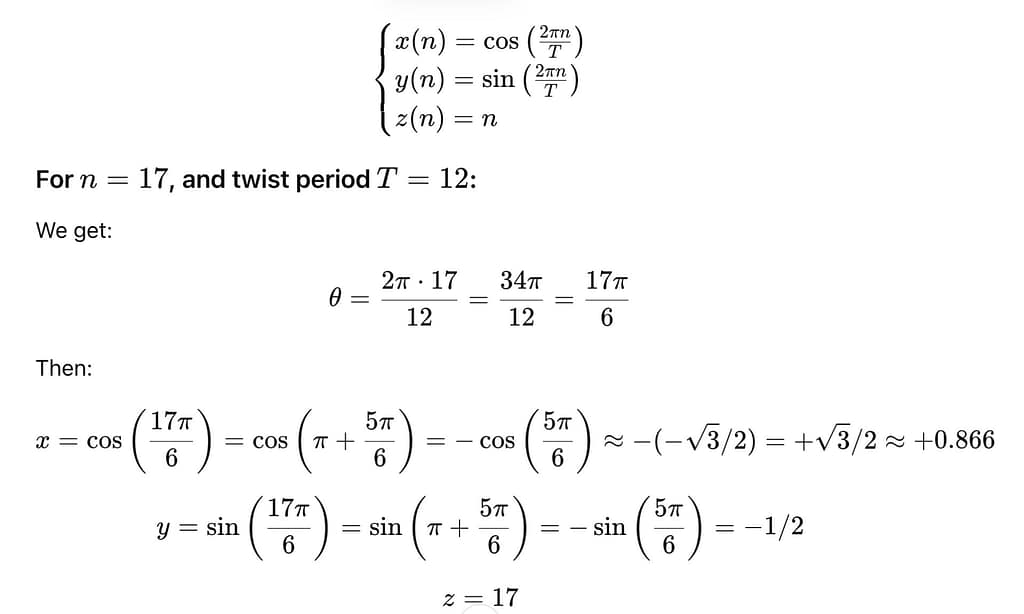 Imagine wrapping the number line around a cylinder, forming a helix in 3D space. At each integer ( n ), we plot a point. If ( n ) is prime, we highlight it. This creates a beautiful 3D spiral of numbers, revealing prime patterns that aren’t obvious in 1D.